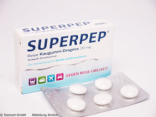 Die Superpep Reise Kaugummi Dragees 20 mg werden zur schnellen Behandlung einer Reisekrankheit mit Übelkeit und Erbrechen angewendet. Die Dragees enthalten den Wirkstoff Dimenhydrinat. Der Wirkstoff ist in der Lage die Ausschüttung der Botenstoffe zu unterdrücken, welche das Brechzentrum im Gehirn stimulieren würden. Übelkeit und Schwindelgefühle gehen zurück und das Erbrechen wird verhindert. Die Superpep Reise Kaugummi Dragees 20 mg werden bei den ersten Anzeichen einer Übelkeit gekaut und verhindern das Erbrechen.