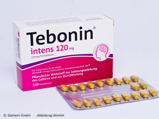 Die Tebonin intens 120 mg Filmtabletten werden zur natuerlichen Behandlung von geistigen Leistungseinbussen, welche hirnorganisch bedingt sind, angewendet. Die Filmtabletten enthalten Ginkgo biloba Blätter Trockenextrakt. Der Trockenextrakt ist in der Lage Symptome, wie Vergesslichkeit und Konzentrationstoerungen zu lindern. Es wird direkt auf die Mitochondrien eingewirkt, genau da wo die Energieproduktion stattfindet. Der Wirkstoff kann sowohl Stoerungen der Mitochondrien aufhalten, als auch geschaedigte Mitochondrien regenerieren. Die Tebonin intens 120 mg Filmtabletten sorgen fuer eine Staerkung der Nervenzellen, so dass das Gedaechtnis wieder besser funktioniert.